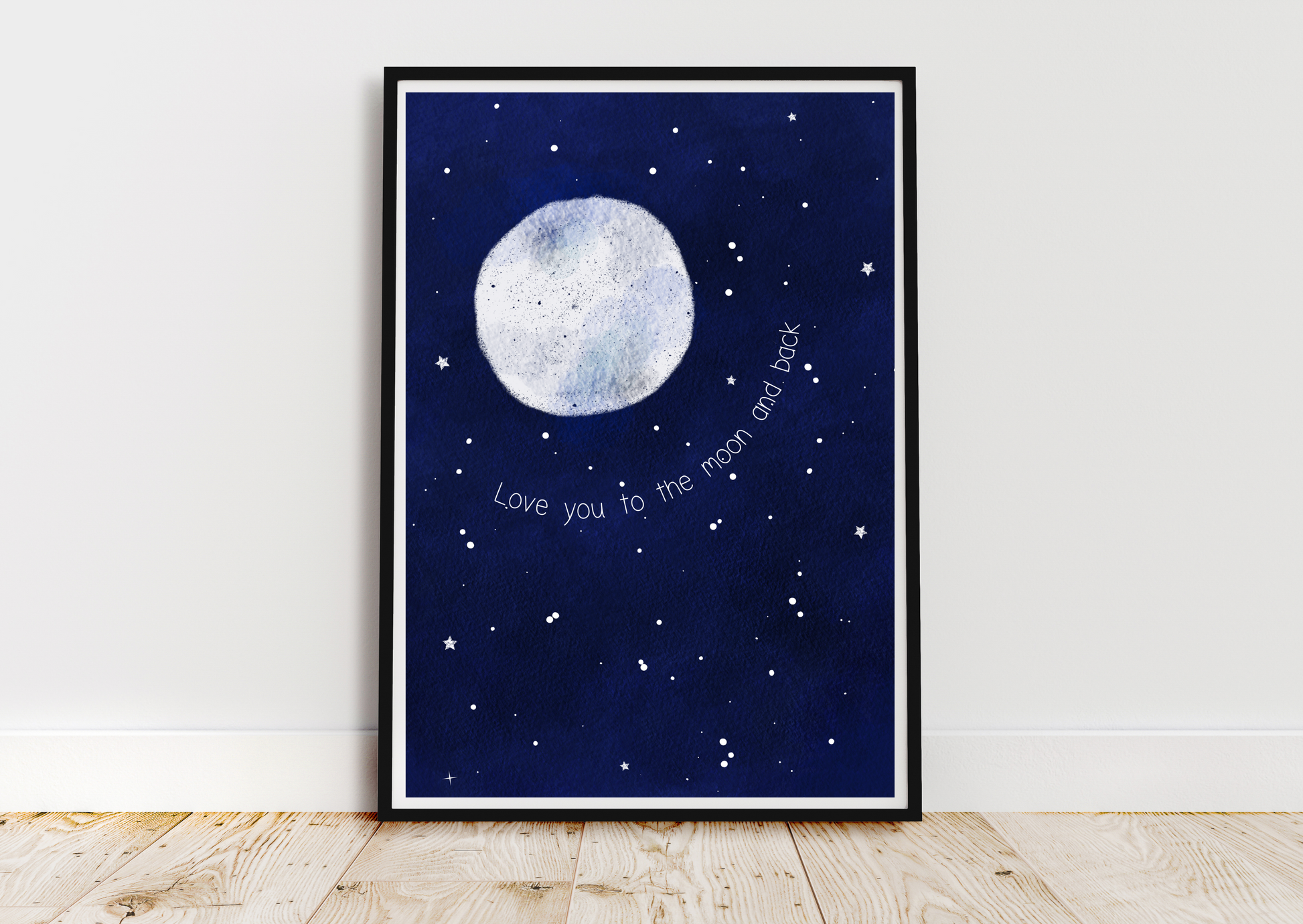 Love you to the moon and back UNFRAMED print available in sizes A5, A4 and A3. Perfect kids bedroom print or nursery decor.